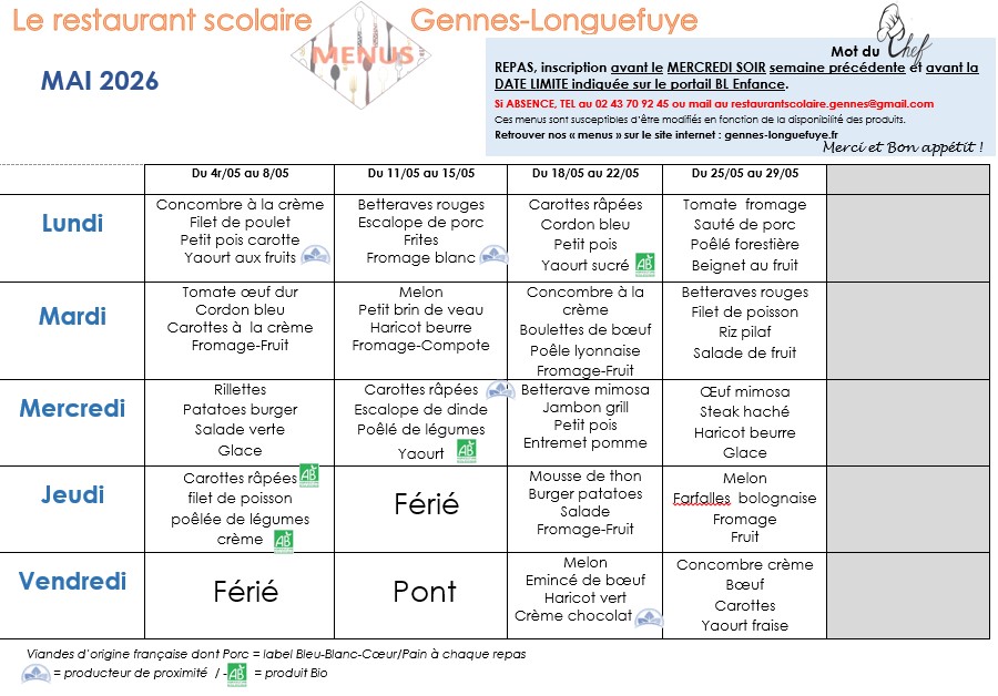 Depuis le 1er janvier 2022, mise en place de la loi Egalim pour favoriser une alimentation plus saine, sûr et durable dont 50% de produits issus de l’agriculture durable et 20% de produits Bio, nous travaillons avec des fournisseurs locaux (La Légumerie53 et Mayoncourt) en plus de nos fournisseurs habituels