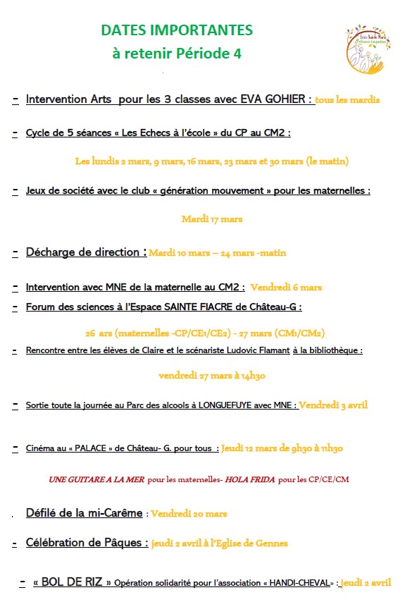 Jeux de société avec les personnes âgées du club « génération mouvement » de la commune, partage de la galette avec les personnes de l’ADMR, élections de délégués, conseil d’établissement : Quel logo pour mon école ?, Défilé de la mi-Carême, célébrations, opérations solidarité…