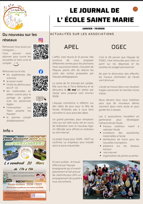 Projet fresque avec l’intervention d’un graffeur et projets artistiques communs aux 3 classes, atelier taille de pierre, classe Echecs, tchoukball, football, matinées sportives avec les écoles du réseau, classe dehors pour les 3 classes avec l’intervention de Mayenne Nature Environnement…