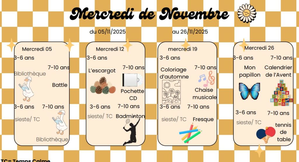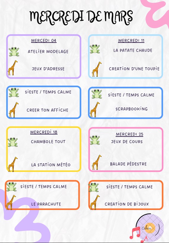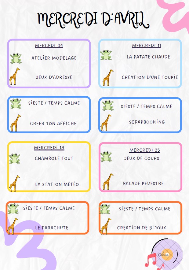Des thèmes sont retenus pour chaque période scolaire. Les activités s’articulent autour de travaux manuels, de modelage, de la peinture, du sport, des chants, de la danse, des spectacles, de la cuisine,…