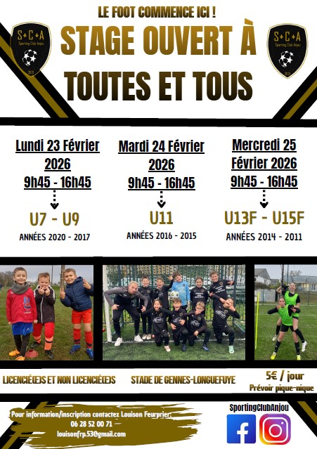 Louison Feurprier, éducateur sportif de l’école de football SCA de Gennes-Longuefuye vous informe de stages organisés, ouverts à Toutes et Tous.